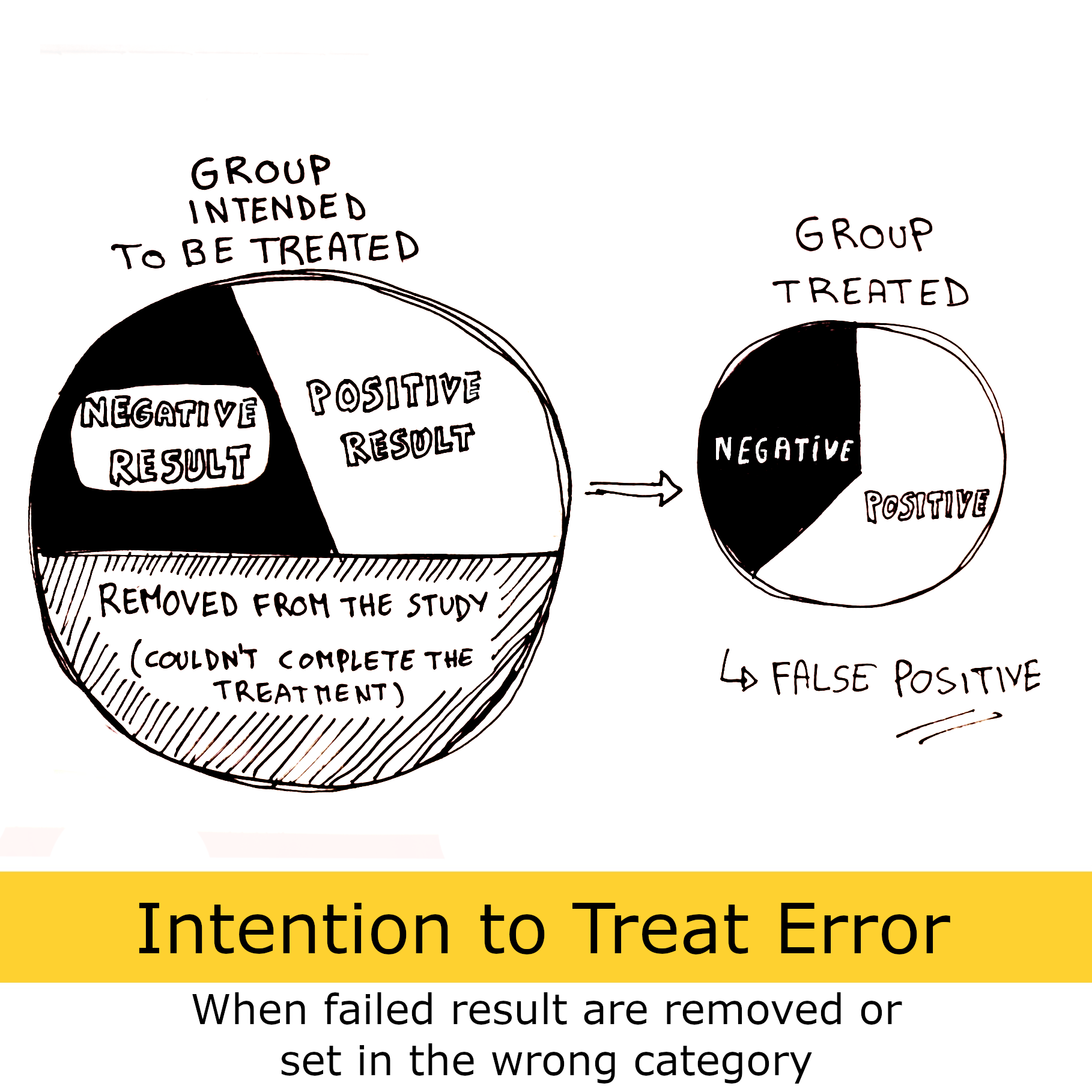 The intention-to-treat error originated in clinical trials, it happens when participants are not analyzed in their original groups, often due to non-compliance or dropouts, leading to biased results. (e.g. False positive).